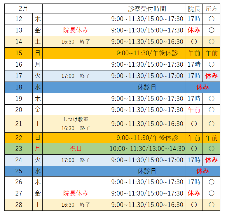 お知らせ お知らせNEWS 2月の予定表 前の記事へ 次の記事へ 最新記事 3月1日から31日まで 春の健康診断キャンペーン 2月の予定表 2026年3月から 診療料金(再診料など)改定のお知らせ 2月21日 しつけ教室の案内 お知らせ(診察時間と土曜日の爪切りの件について) 月別アーカイブ 2026年2月 2026年1月 2025年4月 2024年10月 2024年3月 2023年9月 2022年9月 2020年6月 2020年1月 2019年8月
