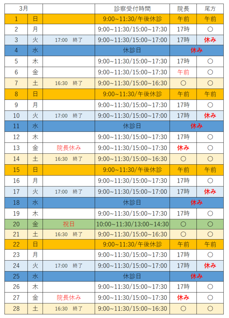 お知らせ お知らせNEWS 3月の予定表 前の記事へ 最新記事 3月の予定表 3月1日から31日まで 春の健康診断キャンペーン 2月の予定表 2026年3月から 診療料金(再診料など)改定のお知らせ お知らせ(診察時間と土曜日の爪切りの件について) 月別アーカイブ 2026年2月 2025年4月 2024年10月 2024年3月 2023年9月 2022年9月 2020年6月 2020年1月 2019年8月