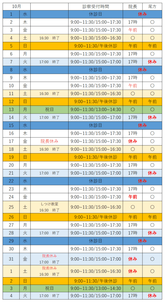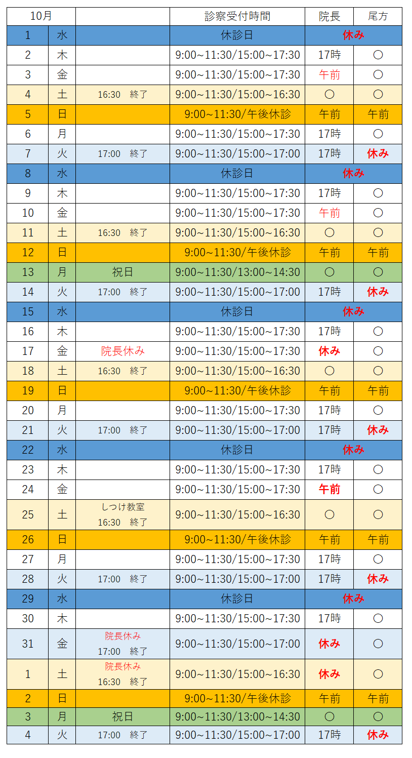 お知らせ お知らせNEWS 10月の獣医師出勤表 前の記事へ 最新記事 10月の獣医師出勤表 秋の健康診断のお知らせ 9月の出勤予定(8/30更新) 診療料金改定のお知らせ お知らせ(診察時間と土曜日の爪切りの件について) 月別アーカイブ 2025年9月 2025年8月 2025年7月 2025年4月 2024年10月 2024年3月 2023年9月 2022年9月 2020年6月 2020年1月 2019年8月